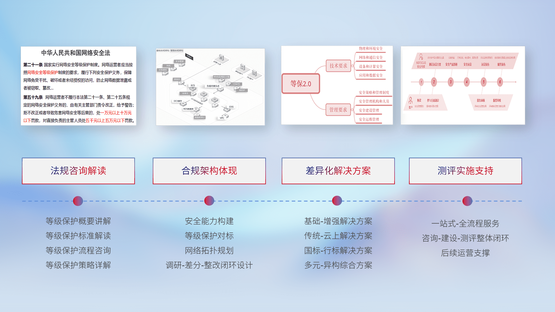 通过专业的法律咨询解读、、、、合规架构体现、、差异化解决方案、、测试实施支持等服务,,,,为客户量身打造等保合规体系。。